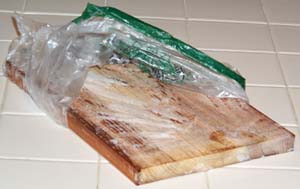 ![]() Can't wait an hour for the plank to soak? Freeze them! ![]() Thats right, I have tested this and it works GREAT. Soak a plank or two for at least two hours, wipe off the access water, oil the smooth side and put them in your freezer. If you like, you can put them in a plastic bag left over from your groceries. The only thing the bag does is keep any frost that may collect from getting on any other foods in your freezer. The next time you want to cook on a Cedar Plank, just reach in your freezer and pull one out, rinse off any ice that may have formed, and your ready to put your food on the planks and put it on the grill or in your oven. You may want to put the plank on the grill or in the oven while it is heating up to warm the plank, but it is not necessary. Our Cedar Cooking Planks also Work Great in your Oven! ![]() ![]() Monday night, I came home and took my planks out of the freezer, preheated my oven to 350 degrees and fired up my grill to medium heat (I do not have a thermometer on my grill). I cut the Salmon in half and placed one half on one plank and the other half on the other plank. After about 15 minutes, I placed one plank on my grill and the other in my oven. I set a timer for 15 minutes and went and changed. After 15 minutes I checked both planks and determined that they both had another 5 minute to go. After five more minutes, I pulled them both out and they were ready to eat. Both perfectly succulent, moist and had that great cedar taste. The only real difference was that the Salmon that was cooked on the grill had more of a cedar smoky taste because the plank on the grill smoldered to give the smoky taste. The plank in the oven did not char or smolder so there was no smoky taste. Even though it did not have the smoky taste, it was still very delicious. If you think about it, it is good that the plank in the oven did not smolder, if it had, my kitchen would have smelt like smoke and may not have been very appetizing. ![]() Notice on the piece made on the grill (upper photo), the lower right area next to the silvery/white back side of the skin, that the pink salmon is shinny because it is very moist. Also notice that the one from the grill (upper) has a little darker look because of the plank smoldering and giving it a smoky cedar flavor and color. Remember never leave your oven or grill unattended for any length of time when using cooking planks, the wood can dry out and catch on fire. Always have a spray bottle of water handy so if the plank does catch on fire, you can spray water on it. Cooking on cedar is fun, easy, clean and convenient. How can I tell when my fish is done? ![]() Keep in mind that different kinds of fish and different thickness will cook at different times. As a rule of thumb, I start by setting a timer for about 10 minutes. When the timer goes off, I go to the grill with a table fork, open the lid and cut into the fish in the center around the thickest part of the fish. If you feel resistance, like it is still raw/rare, not cooked, you know that it has about another 5 minutes to go. Close the lid. (When checking on any food on your grill, always minimize the time the lid is open.) Wait 5 minutes and go back to the grill and check again, this time in a little different spot. Notice that the place that you cut the first time will have healed (see the photo above of the salmon that is on the plate, it has a pinkish line across the middle where I cut into it to make my 10 minute test). This time if it feels like there is no resistance. like it may be done, with the fork in the fillet, try to use the fork to peel back one side to check what color the fish is. With Salmon, it will be slightly pinker if it is less cooked. I am a sushi lover and I like my Salmon (and all my fish) on the rare side, so I would tend to cook my fish less. For those that like it a little more done, again look toward the center of the cut (thickness) and notice , if it is a silky color, it is less done, if it is a slightly duller color, it is cooked all the way through. A word of caution when looking at the color to determine doneness, cooking on cedar, because of the added moisture, the fish will most always have a more shinny look inside because it is very moist and not dried out. If you need to, again using your table fork, spear down into the fillet making a small square and gently digging it out to look and taste it to see if it done enough for you, if it is, remove the plank and fish onto a heat resistance plate, server or surface. You can then take the plank and fish into the house or remove the fish onto a nice serving platter and serve. The above also goes for using our cedar planks in your oven. Remember not to set your oven above 350 Degrees F when cooking with our cedar planks. Temperatures above 350 may cause the plank to catch on fire. Never leave your oven or grill unattended for any length of time and always have a spray bottle of water handy. Can I use my planks for more then one use? It may be possible to use our cedar cooking planks for more then one use. The main factor in determining whether or not you wish to reuse a plank is one of bacteria left over from the food from the first use. Other factors that determine multiple uses are as follows. You make the ultimate assessment. ![]()